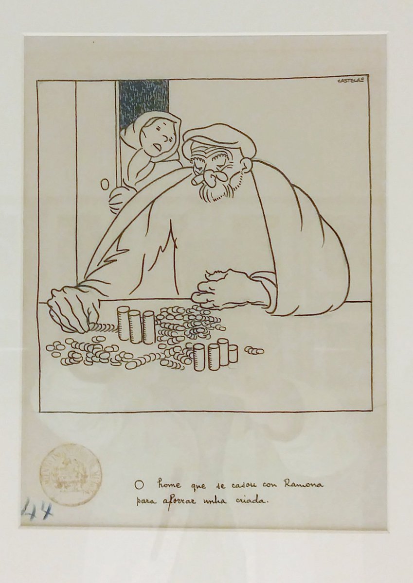 Nos debuxos que se amosan na sala podemos constatar que as críticas que facía Castelao por este medio non quedan tan arredadas no tempo. Poñamos por caso o do home vello e cobizoso que está a contar os seus cartos na mesa mentres por detrás asoma unha muller. O pé é ben significativo: “O home que se casou con Ramona para aforrar unha criada”.